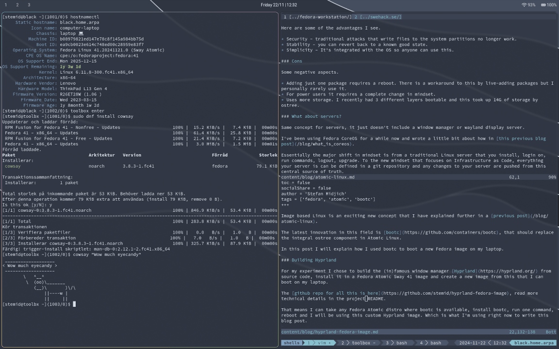 That means I can take any Fedora Atomic distro where bootc is available, install bootc, run one command, reboot and I will be using this custom Hyprland image. Which is what I’m using right now to write this blog post.